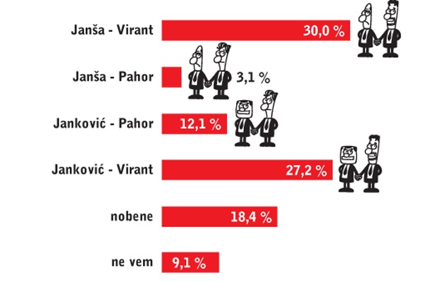 Anketirancem smo ob tem postavili tudi vprašanje, katero koalicijo bi najraje podprli. Izbrali smo nekaj možnih kombinacij, kombinacijo Janša-Virant, Janša-Pahor, Janković-Pahor in Janković-Virant. Kombinacijo Janković-Janša smo izpustili, ker je Janković takšno možnost že zavrnil. Rezultati kažejo, da bi bila za ljudi razmeroma najbolj sprejemljiva kombinacija Janša-Virant. To je izbralo 30 odstotkov vprašanih. A je ob tem vendarle treba tudi upoštevati, da je skoraj 40 odstotkov vprašanih zavrnilo vsakršno kombinacijo z Janšo. Tako bi recimo 27 odstotkov ljudi najraje videlo nekakšno »veliko« koalicijo med Jankovićem in Virantom, 12 odstotkov pa »levo« koalicijo med Jankovićem in Pahorjem.
