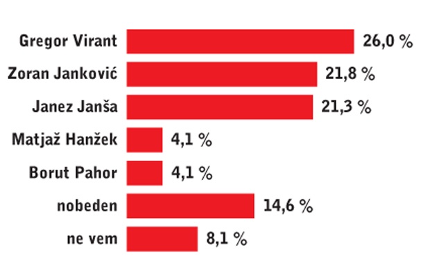 Rezultati kažejo, da je premier Borut Pahor praktično že skorajda izločen iz igre, saj je dobil zgolj štiriodstotno podporo, uvodni zagon pa je pošel tudi Matjažu Hanžku s stranko TRS. Ob tem je sicer treba upoštevati, da je bila anketa narejena 17. in 18. oktobra, ko je bila v središču javnomnenjske pozornosti prav Virantova lista, ki je tedaj organizirala svoja prva medijsko odmevna srečanja. Čeprav približno 15 odstotkov vprašanih ni izbralo nikogar, pa naše tokratno merjenje vendarle kaže na veliko skupno podporo Virantu in Janši pred podporo Jankoviću, Pahorju in Hanžku.