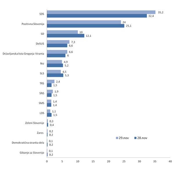 Anketa, ki jo je ekipa Ninamedie na vzorcu 600 anketiranih izvedla v zadnjih treh dneh (merimo pa že štiri dni zapored), je pokazala, da se SDS utrjuje na prvem mestu, saj vodi že s 35,2 odstotka podpore, sledi ji Pozitivna Slovenija Zorana Jankovića s 24 odstotki, ki ji podpora miruje, na tretjem mestu je SD z 10 odstotki. Če se je zdelo ob začetku merjenja, da imata tako Jankovićeva lista kot SD še neko zalogo glasov, meritev v tem trenutku temu ne pritrjuje. Na presenetljivem četrtem mestu ostaja DeSUS, ki mu podpora še narašča in zdaj znaša že 7,3 odstotka anketiranih, stranki upokojencev pa sledi Državljanska lista Gregorja Viranta s 6,6-odstotno podporo. Stranki, ki naj bi se po štirih dneh meritve še uvrstili v državni zbor, sta NSi s 4,9 odstotka podpore in SLS s 4, 5 odstotka podpore. Bolj zaznavna je še TRS Matjaža Hanžka, ki se je prebila nad dva odstotka (podpora znaša 2,4 odstotka). TRS lahko preseneti. Popolnoma pa ne gre odpisati niti Zares niti LDS, pa čeprav ju ankete uvrščajo daleč pod prag vstopa v parlament.