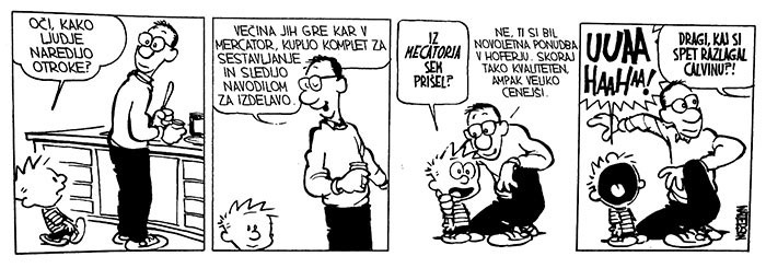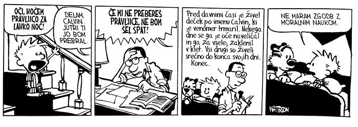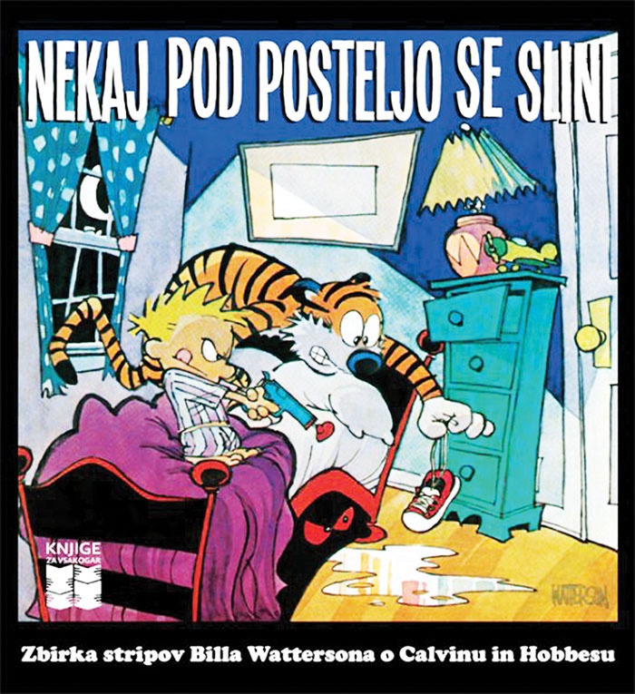 Calvin in Hobbes, junaka ene zadnjih ameriških časopisnih stripovskih klasik, ki jo je na vrhuncu slave objavljalo kakih 2400 časopisov v 50 državah, knjige z njunimi zbranimi prigodami pa so se do sedaj prodale v 45 milijonih izvodov, sta tako po več kot četrt stoletja odlično prevedena in v dostojni podobi naposled prispela tudi v Slovenijo. Prva knjiga stripov z naslovom Nekaj pod posteljo se slini je pod okriljem projekta »Ljubljana - svetovna prestolnica knjige - knjige za vsakogar« izšla pri založbi Didakta in ima izjemno popularno ceno 5 evrov. Nobenega razloga ni, da si je ne bi privoščili.