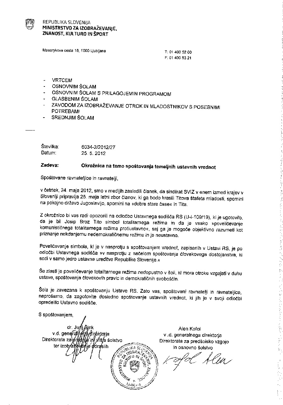 Danes je ministrstvo za izobraževanje vrtcem in šolam poslalo okrožnico, v kateri je pozivalo k spoštovanju ustave in spoštovanju ustavnih vrednot. Spletni portal Požareport je namreč poročal, da naj bi lokalni predstavniki Sindikata za vzgojo in izobraževanje SVIZ pred osnovno šolo Mladika na Ptuju danes organizirali Titovo štafeto Mladosti.