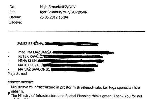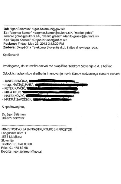 Tajnica iz kabineta ministra Zvonka Černača (SDS) pošlje nov seznam nadzornikov Telekoma državnemu sekretarju Igorju Šalamunu.