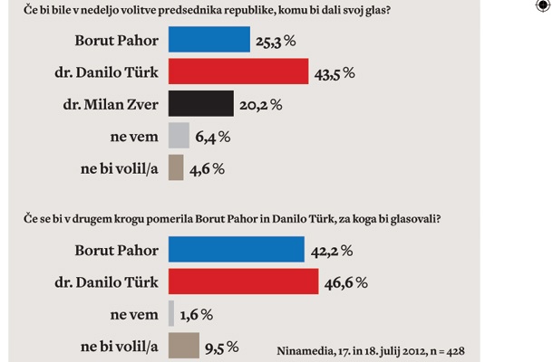 Kako bo jeseni? Ankete in politična realnost kažejo, da so resni kandidati trije, aktualni predsednik Türk, Borut Pahor in Milan Zver. Raziskava, ki jo je na začetku tedna izvedla agencija Ninamedia, je pokazala, da bo v prvem krogu najzanimivejši boj za drugo mesto. Pahorja bi namreč podprlo 25 odstotkov volivcev, Zvera pa 20. Razlika ni zelo velika. Stvari postanejo zanimive v drugem krogu. Po izmerjenih rezultatih se zdi, da bo velika večina Zverovih volivcev v drugem krogu podprla Boruta Pahorja, nekdanjega premiera, ki ga je Zverova SDS pred manj kot letom dni izgnala z oblasti. Po merjenju v drugem krogu Türk ne bi dobil veliko novih volivcev, a vseeno dovolj za zmago.