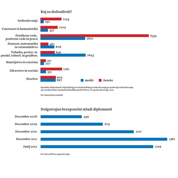 A vsi diplomanti ne dobijo službe. Na zavodu za zaposlovanje pravijo, da je razlogov več, od prevelikega vpisa na nekatere visokošolske programe do kriznih razmer, ki so prinesle več stečajev in presežnih delavcev v nekaterih panogah. V zadnjih petih letih se je število dolgotrajno brezposelnih mladih diplomantov celo občutno povečalo. Decembra 2008 jih je bilo 449, junija letos pa že 1229. Med njimi je veliko komercialistov, diplomiranih upravnih organizatorjev, diplomiranih varstvoslovcev, profesorjev slovenščine in poslovnih sekretarjev. Daleč največ pa je ekonomistov in pravnikov – in prav ti dve kategoriji sta poseben fenomen. Povpraševanje delodajalcev po obeh profilih je pravzaprav veliko. Ker pa je tudi ponudba velika in ker vsako leto kljub zmanjševanju števila študentov na družboslovnih smereh v zadnjih sedmih letih dobimo nov, še vedno zajeten paket diplomantov s teh dveh področij (pri čemer je treba opozoriti, da vsi študijski programi vseeno niso enako kakovostni), služb za vse, ki si konkurirajo, preprosto ni dovolj.