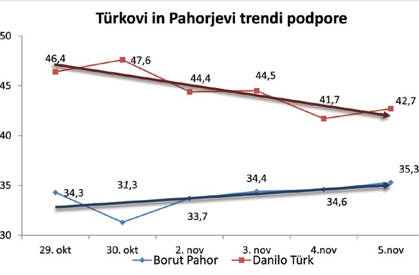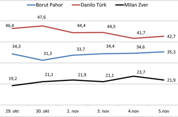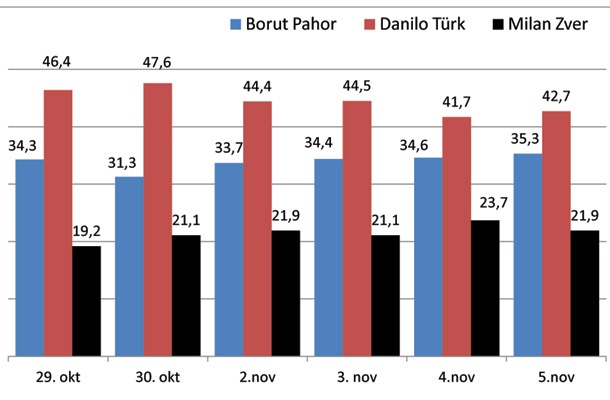 Če se bo jutrišnja raziskava pokazala vnovičen padec podpore Danilu Türku, ne pa recimo ponovne rasti, kot se je zgodilo danes, bo lahko na nedeljskih volitvah razlika med Türkom in Pahorjem relativno majhna, če se celo ne bo zgodilo še kakšno večje presenečenje. A tu gre vseeno za statistične napovedi, ki ne morejo predvidevati dogajanja v naslednjih dneh, uspešnih in neuspešnih televizijskih nastopov, uspešnih ali neuspešnih pogajanj okoli referenduma, uspešnih ali neuspešnih afer, ki se spletajo predvsem okoli aktualnega predsednika. Kljub domnevno bleščečim televizijskim nastopom Borut Pahor od začetka merjenja vseeno ni pridobil več kot samo eno odstotno točko podpore.