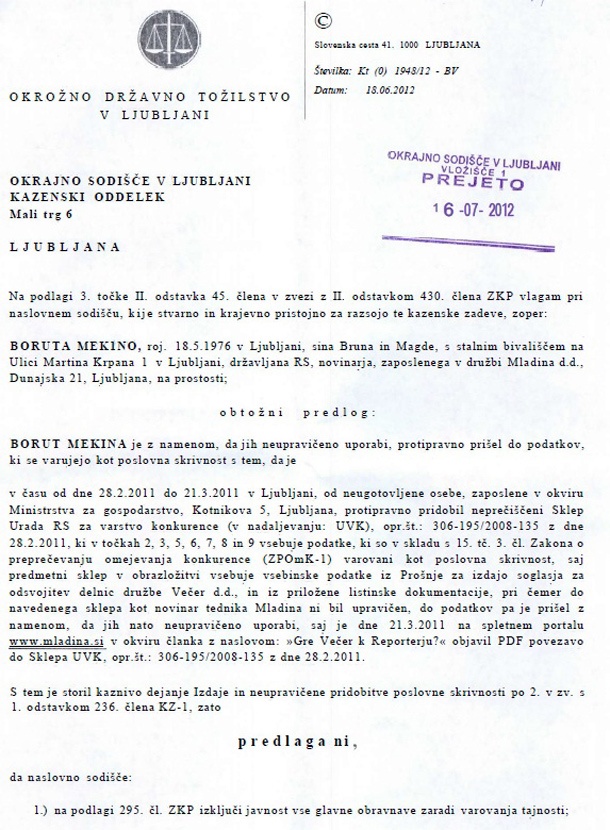 Na tej podlagi so kriminalisti konec leta 2011 sprva zaslišali odgovornega urednika Mladine Grego Repovža, saj so hoteli izvedeti, kdo je Mladini izročil dokument. Nato je policija primer zaključila z naznanitvijo kaznivega dejanja zaposlenega na ministrstvu za gospodarstvo, v skladu s sodno prakso, kot je zapisala, pa je novinarje Mladine pustila pri miru. A je konec januarja tožilstvo od kriminalistov zahtevalo dopolnitev ovadbe – po novem so storitve kaznivega dejanja objave poslovne skrivnosti osumili novinarja Mladine Boruta Mekino. Ta je bil tudi zaslišan in nato julija »obtožen kaznivega dejanja neupravičene uporabe podatkov, ki naj bi se varovali kot poslovna skrivnost«. Tožilstvo je sodišču pri tem predlagalo, da se iz obravnave izključi javnost in da se novinar kaznuje z zaporom do treh let.