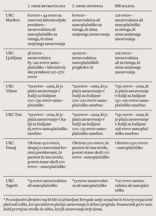 Nekaj večjih univerzitetnih kliničnih centrov (UKC) pri nas in v sosednjih državah smo vprašali, kakšen račun bi slovenski državljan dobil, če bi se naročil na prvi pregled pri revmatologu ali ortopedu ali če bi želel na magnetno resonanco kolena.