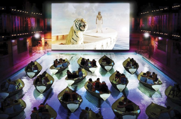 Film, katerega glavni junak Pi oziroma Piscine, je dobil ime po francoski besedi za bazen, prikazuje zgodbo mladeniča, ki se po brodolomu znajde v reševalnem čolnu v družbi tigra. Med decembrsko premierno projekcijo v pariškem bazenu Piscine Pailleron, zgrajenem leta 1933, so gledalci sedeli v rešilnih čolnih, oblečeni v rešilne jopiče in opremljeni z očali za spremljanje 3D-projekcije. Tigra v bazenu sicer ni bilo, a kljub temu so bili deležni dveurne formidable filmske izkušnje. Res škoda, da pri nas ljubljanskim kolosalnim filmovrtom pustolovski duh in domišljija ne sežeta niti čez cesto do bazenov Atlantisa.