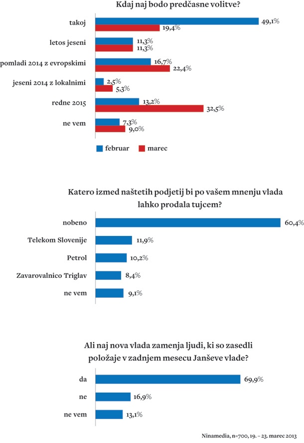 Po anketi, ki jo je Ninamedia opravila prejšnji teden, je za takojšnje volitve le še 19,4 odstotka anketiranih. Največ vprašanih, 32,5 odstotka, zdaj hoče, da bi bile volitve leta 2015, kot so predvidene. Takojšnjih volitev si želi 42,4 odstotka volivcev Slovenske demokratske stranke, med privrženci nobene druge parlamentarne stranke pa zagovornikov takojšnjih volitev ni več kot dvajset odstotkov.