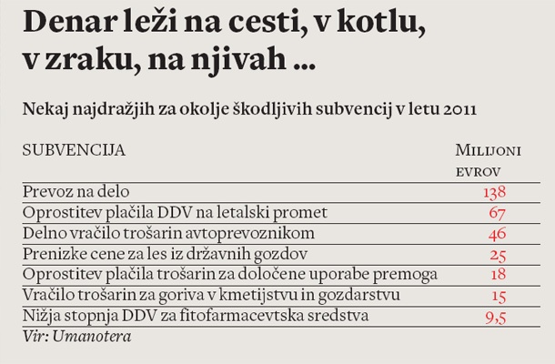 Pri okoljevarstveni organizaciji Umanotera so v nedavno objavljenem poročilu o okolju škodljivih subvencijah našli za več kot 500 milijonov evrov (1,4 % BDP-ja) na ta račun izgubljenega proračunskega denarja na leto. »Te subvencije se glede na težave s financiranjem in zmanjševanjem trenutnega proračunskega primanjkljaja zdijo povsem nelogične,« so zapisali v uvodu v poročilo. In na vlado naslovili poziv k njihovi postopni ukinitvi. Že v rebalansu proračuna za leto 2014 bi po njihovem mnenju tako brez večjih težav pridobili dodatnih 100 milijonov evrov sredstev in se na ta način izognili dodatnim rezom v šolstvo, zdravstvo in socialne transferje.
