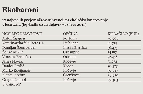 Tudi sicer je med prejemniki najvišjih subvencij za ekološko kmetovanje zbrana zanimiva druščina. Največ, skoraj 47 tisoč evrov, je lani (izplačilo je za leto 2011) dobil Anton Žgajnar, za ekološko rejo krav molznic. Kmetija Žgajnar iz okolice Postojne je tudi prodajala ekološko mleko, v lasti imajo tri mlekomate. A letos jih na seznamu prejemnikov ekoloških subvencij ne boste našli. Zaradi uporabe nedovoljene snovi za gnojenje pašnikov (šlo naj bi za predelane živalske ostanke) so jim lani odvzeli ekološki certifikat. Primerov, ko resnost kršitve zahteva odvzem certifikata, sicer med ekološkimi kmetijami ni veliko, le trije do štirje na leto.