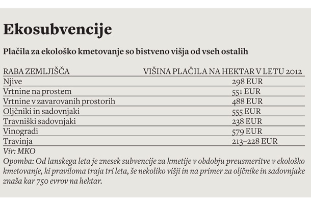 Podpiranje ekološkega kmetijstva je hvaležno stališče za vsakega politika. Zagovarjanje uporabe pesticidov in intenzivne reje živali pač ne prinaša političnih točk. Temu primerno je spodbujanje ekološkega kmetijstva v zadnjih letih postalo prednostna naloga slovenske kmetijske politike. Akcijski načrt razvoja ekološkega kmetijstva, ki ga je Janševa vlada sprejela leta 2005, je predvideval celo, da naj bi do leta 2015 ekološke kmetije pomenile kar 15 odstotkov vseh kmetij in 20 odstotkov vseh kmetijskih površin v uporabi. Cilji se sicer kljub 10-odstotni letni rasti števila ekoloških kmetij še zdaleč ne bodo uresničili. Po poročilu o stanju slovenskega kmetijstva iz junija letos je bilo v letu 2012 v ekološki nadzor vključenih nekaj manj kot 2700 kmetij oziroma »le« 3,6 odstotka vseh slovenskih kmetij. A že na tem vzorcu je jasno vidno, da je slovenska politika spodbujanja ekološkega kmetijstva ekonomsko vprašljiva. 2700 ekoloških kmetij je obdelovalo 7,2 odstotka vseh kmetijskih zemljišč v uporabi, a so zagotavljale le nekaj desetink odstotka hrane za slovensko tržišče.