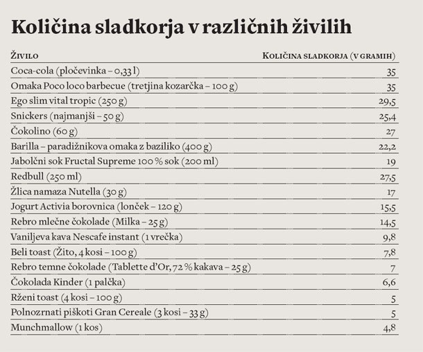 Po izračunih SZO naj bi bila še dopustna dnevna količina sladkorja okoli deset odstotkov energije, ki je na dan potrebuje telo. To je 180 do 200 kalorij oziroma okoli 50 gramov (10 kock ali vrečk sladkorja, kakršne dobimo h kavi) sladkorja. Toliko sladkorja pa vsebuje ena sama pollitrska plastenka katerega izmed priljubljenih sladkih napitkov, od sadnih sokov do gaziranih pijač. Težava z njimi ni le, da imajo preveč kalorij, temveč so slajene s fruktozno-glukoznim sirupom, ki se v telesu presnavlja drugače kot navaden sladkor. Na to je leta 2009 z javnim predavanjem, ki je zbudilo veliko pozornosti, opozoril ameriški pediater in endokrinolog s Kalifornijske univerze v San Franciscu, dr. Robert Lustig. Za razliko od namiznega sladkorja – saharoze, ki je sestavljena iz 50 odstotkov glukoze in 50 odstotkov fruktoze, v fruktozno-glukoznem sirupu prevladuje fruktoza. Ta pa se, kot opozarja Lustig, presnavlja le v jetrih, kjer je predelana v sečno kislino in maščobe. Zato ima pretirano uživanje fruktoze enak učinek kot zelo mastna hrana. Človeka poredi. Fruktoza tudi ne zavira leptina – hormona za uravnavanje lakote, zato pri pitju sladkih pijač ne čutimo, kdaj je sladkorja že občutno preveč. Pri Coca-Coli so našli še dodatno rešitev za spodbujanje porabe: v pijačo dodajajo sol, zato se človek z njo tako rekoč nikoli ne odžeja. In ko so jetra preobremenjena, ledvicam povečane količine sečne kisline ne uspe dovolj hitro izločiti iz telesa. Poveča se nevarnost za razvoj putike, visokega krvnega tlaka in še česa. Zato je Lustig pred leti sladkor označil za toksičen.