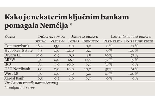 Seveda ni šlo samo za to, da je država v banke zmetala milijarde pomoči. Tudi same banke so se prestrukturirale, pospešeno čistile bilance in zmanjšale svoje stroške poslovanja. Od marca 2008 do septembra 2012 se je količnik temeljnega kapitala (Tier 1) v večjih nemških bankah povzpel z 8,2 odstotka na 13,6 odstotka. Za primerjavo: v največji slovenski banki NLB je ob koncu leta 2012 ta količnik znašal 9,9 odstotka, v polletju letošnjega leta 9,8 odstotka, na ravni Skupine NLB v prvem polletju letošnjega leta pa je znašal samo 8,5 odstotka.