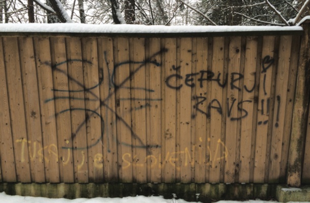 Antiteza: Drugo dejanje. Oseba, nedvomno avtohtone vrste, je prečrtala srbsko nacionalno geslo in pod njim dopisala TUKAJ JE SLOVENIJA ter s tem sporočila, da je tu, četudi gre za živalski vrt, še vedno Slovenija. Glede na dejstvo, da se je večina prebivalcev za ograjo rodila tu, kjer je Slovenija, so tudi oni nedvomno pripadniki avtohtone vrste. Tistih nekaj priseljencev, ki so se rodili v drugih živalskih vrtovih, pa je že asimiliranih in imajo že tudi slovenska imena, na primer opica Mojca, ki se je rodila leta 1974 v Afriki. Imena Mojca namreč v Afriki ni moč zaslediti, niti med opicami ne.
