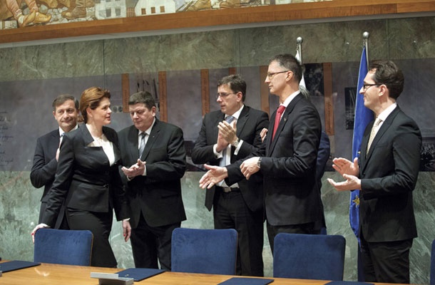 Alenka Bratušek in njeni koalicijski kolegi med ceremonijo ob podpisu druge koalicijske pogodbe.