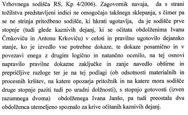 Da v sodbi ni navedeno, kje točno, na katerem kraju je Janša sprejel obljubo plačila nagrade, ne pomeni, da je sodba v tem delu nesklepčna, je še zapisalo višje sodišče. »Še posebej, ker podatek o kraju in času storitve kaznivega dejanja zgolj pripomore k individualizaciji konkretnega kaznivega dejanja, sicer pa to nista zakonska znaka, niti nista, kot to zmotno meni pritožnik, odločilni okoliščini, ki bi v konkretnem primeru kakorkoli vplivali na obstoj očitanega kaznivega dejanja oziroma na kazensko odgovornost obdolženega Janše«.
