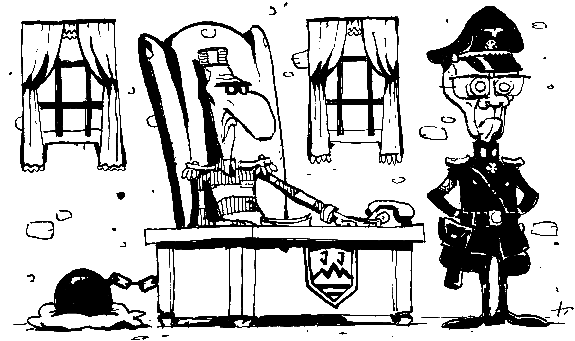 V štabu Generala Glanzkopfa so našli primerno rešitev za odsluženje krivične kazni, ki mu jo je odredilo komunajzarsko sodišče. (opravljal bi družbeno koristno delo predsednika vlade druge republike press)