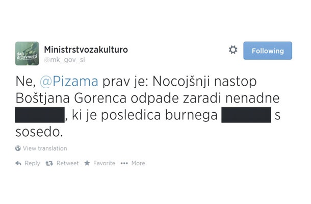 V zadnjih štirinajstih dneh sta bila taka primera dva. Prvi je iz Slovenije – komik Boštjan Gorenc Pižama je prilagodil tvit ministrstva za kulturo. Prvotni tvit se je glasil »Minister Grilc si je ogledal tudi Zgodovinski arhiv Ptuj.« Pižama ga je prilagodil v: »Anonimizirano po pravilih: █████████ si je ogledal tudi Zgodovinski arhiv █████.« Na tej točki se po navadi komunikacija z ustanovami neha, a tokrat se je Petra Škofic, ki med drugim skrbi za račun in je tudi vodja kabineta ministra za kulturo, odzvala z: »Ne, @Pizama, prav je: Nocojšnji nastop Boštjana Gorenca odpade zaradi nenadne █████, ki je posledica burnega █████ s sosedo.« Takšnih primerov je na Twitterju malo in ministrstvo za kulturo si zasluži pohvalo.
