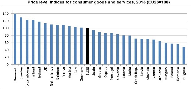V primerjavi s povprečjem 28 držav članic EU so dobrine in storitve najdražje na Danskem, kjer zanje v povprečju plačajo 40 odstotkov več kot drugod po Uniji. V Luksemburgu storitve in blago stanejo okrog 20 odstotkov več, v Bolgariji pa so cene več kot za polovico nižje v primerjavi s povprečjem EU, kažejo podatki Eurostata.