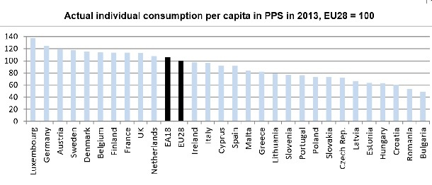 Evropski statistični urad Eurostat je objavil podatke o dejanski potrošnji posameznikov (Actual Individual Consumption) v letu 2013. V primerjavi s povprečno potrošnjo na ravni osemindvajsetih držav članic Evropske unije so največ potrošili Luksemburžani, najmanj pa Bolgari. V Luksemburgu je posameznik potrošil 40 odstotkov več kot povprečen Evropejec, Bolgar pa za približno polovico manj od povprečja.