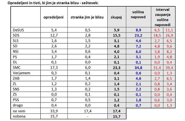 Poleg teh bi se v parlament uvrstila še NSI s 6 odstotki in verjetno tudi SLS s 4,6 odstotki ter Zavezništvo Alenke Bratušek s 4,6 odstotki. Pozitivni Sloveniji s 3,1 odstotkom podpore to verjetno ne bi uspelo, ravno tako ne Združeni levici, ki bi jo izbral 2,1 odstotek vprašanih.