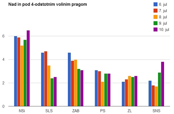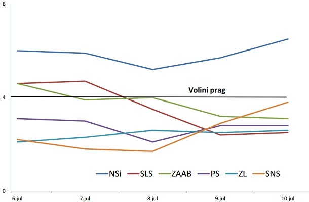 Podobno se je zgodilo na spodnjem delu lestvice. Tokrat smo v pregled prvič resneje vključili tudi Jelinčičevo SNS. Nacionalisti namreč pridobivajo in so že skoraj dosegli parlamentarni prag. Ostale stranke, razen NSi, ki si je vstop v parlament po vsej verjetnosti zagotovila, so vsaj za zdaj daleč od parlamentarnega pragu.