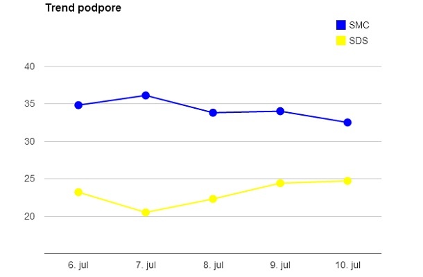 Če smo lahko včeraj govorili o samo majhni rasti SDS in nespremenjeni podpori SMC, pa je četrtkovo merjenje, do volitev je samo še tri dni, pokazalo novo majhno rast SDS-a in padec podpore Miru Cerarju. Pozor, še vedno gre za majhne premike volilnega telesa, a razlika med SDS in SMC je prvič manj kot 8 odstotnih točk. Kljub temu pa je Janši v štirih dneh uspelo prepoloviti razliko med SMC in SDS. Na začetki tedna je bila razlika skoraj 16 odstotnih točk, tokrat samo še osem. Več>>