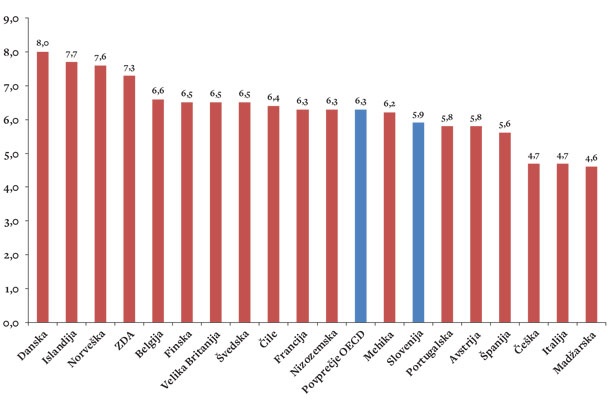 Slovenija je po deležu bruto družbenega proizvoda, ki ga namenja za izobraževanje, podpovprečna, poleg tega pa je tudi ena redkih držav, v katerih ta delež v zadnjih letih pada. Čeprav smo med državami, kjer je zasebnih vložkov v izobraževanje malo, smo podpovprečni tudi po deležu javnih izdatkov, ki ga namenjamo za izobraževanje, in tudi po deležu, ki ga javni izdatki za izobraževanje predstavljajo v BDP-ju.