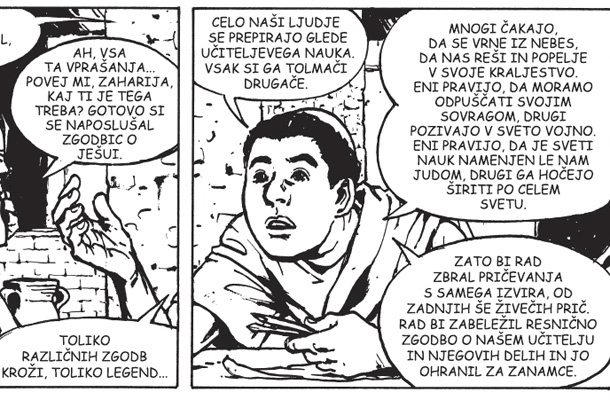 V bistvu se je vse začelo s spreminjanjem vode v vino. Z dokaj preprostim trikom, ki pa ob pravem času na pravem mestu deluje kot čudež. In ta čudež seveda ni bil edini. Zahariji bo živahni starec v opoju žlahtne kapljice in ob žvenketu denarja razkril še marsikaj nezaslišanega iz življenja mladega Ješue in njegove tolpe. In večina starčevih zgodb se močno razlikuje od tistih, ki jih poznamo. Razlikuje se tudi od legend, ki jih častimo. In hej, razlikuje se tudi od svetopisemskih resnic, ki jih jemljemo za edine zveličavne.