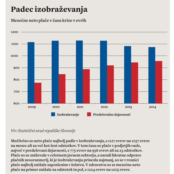 Leta 2009 je vlada Boruta Pahorja zamrznila napredovanja v javnem sektorju, v naslednjih letih so bili zmanjšani regresi, povračila potnih stroškov, zamrznjena izplačila delovne uspešnosti … Največji poseg v plače javnega sektorja je naredila druga vlada Janeza Janše leta 2012. Takrat so sindikati privolili v osemodstotno linearno znižanje ob hkratni odpravi plačnih nesorazmerij, ki so izhajal iz plačne reforme dr. Gregorja Viranta, ministra za javno upravo v prvi Janševi vladi. To je najbolj prizadelo učitelje, saj so z odpravo plačnih nesorazmerij dobili manj kot ostali. Plače v izobraževanju so se od leta 2009 znižale za šest odstotkov, v zdravstvu pa na primer za odstotek in pol.