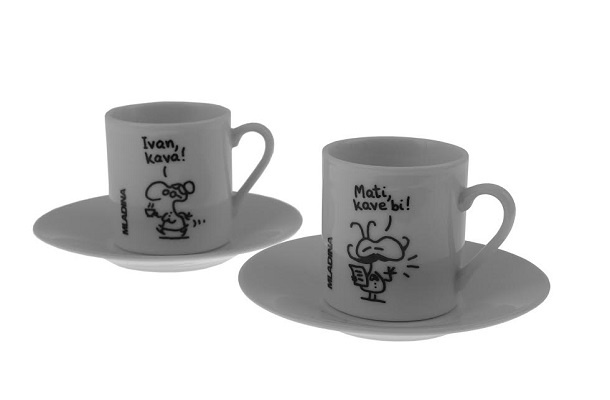 2 skodelici za kratko kavo in krožnička z različnima motivoma. Ena MATI, KAVE BI! in druga IVAN, KAVA!