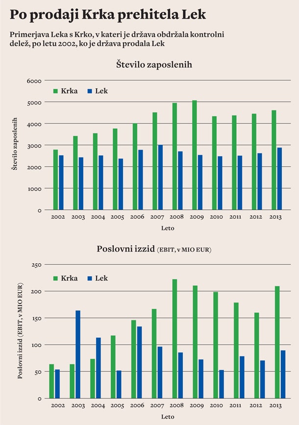 Prodaja Leka švicarskemu Novartisu ni le največja privatizacijska zgodba doslej, ampak za marsikoga tudi ena najbolj pozitivnih. Novartis, ki je leta 2002 za Lek odštel 880 milijonov evrov, ni ukinil Lekovih razvojnih oddelkov, ampak je v tem času v podjetje tudi ogromno vlagal. Malce drugačno plat prevzema pa pokaže primerjava s Krko, v kateri je država obdržala četrtinski, kontrolni delež. Leta 2002 sta bili obe podjetji približno enako veliki. A Krka je v zadnjih desetih letih, med letoma 2003 in 2013, število zaposlenih povečala s 3400 na 4600, Lek pa je ohranil okoli 2500 do 2800 delovnih mest. Poleg tega Novartis nima sedeža v Švici le zaradi naravnih lepot te dežele, ampak seveda tudi zaradi t. i. davčne optimizacije. To se očitno pozna tudi pri Leku. Krka in Lek sta do leta 2002 ustvarila približno enako čistega dobička, po letu 2002 pa so Krkini čisti dobički rasli, Lekovi pa se zmanjševali, s čimer je Slovenija dobila tudi manj davka. Lek recimo danes v obliki davkov in prispevkov na leto prispeva 3,5-kratnik sredstev, ki jih Zavod za zdravstveno zavarovanje (ZZZS) na leto nameni za Lekova zdravila, Krka pa v obliki davkov in prispevkov na leto prispeva 4,7-kratnik sredstev, ki jih ZZZS vsako leto nameni za njena zdravila. Po desetih letih torej Krka v proračun prispeva za približno 30 odstotkov več od Leka.