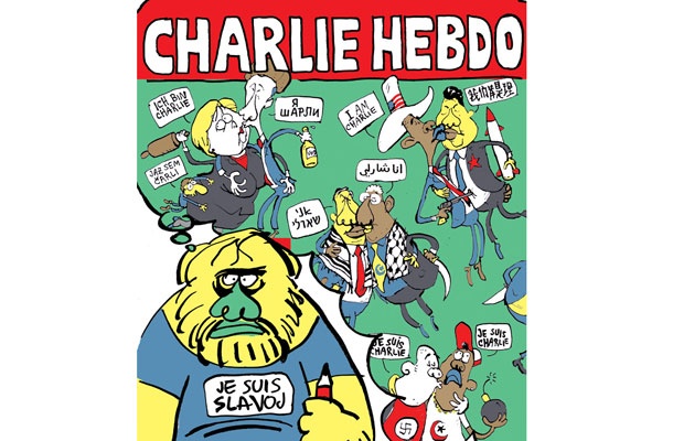 Misliti pomeni, da presežemo patos univerzalne solidarnosti, ki je eksplodirala v dneh po dogodku in dosegla vrhunec 11. januarja, v nedeljskem spektaklu, kjer so se za roke držala velika politična imena z vsega sveta, od Camerona do Lavrova, od Netanjahuja do Abasa – če je kdaj obstajala kakšna podoba hipokritske zlaganosti, je bila to nedvomno ta. Prava gesta v slogu tednika Charlie Hebdo bi bila objava naslovnice, ki se grobo in neokusno norčuje iz tega dogodka, s karikaturami Netanjahuja in Abasa, Lavrova in Camerona ter drugih parov, ki se strastno objemajo in poljubljajo, medtem ko za hrbti brusijo nože.