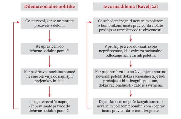 Zakaj je dilema slovenske socialne politike enaka dilemi iz satire Kavelj 22? Zato, ker se z legitimnostjo veljavne zakonodaje ustvarja nova socialnost na samoumeven način, ki je zdaj novo bistvo socialne države. Tu je razlog, da se nam zdi samoumevno, da pomoč ni več pomoč, pač pa vselej sredstvo za nekaj drugega. V tem primeru je denarna socialna pomoč sredstvo za »aktivacijo« najrevnejših, da bi bili bolj »fleksibilni« pri povpraševanju po najslabših, najtežjih, najmanj varovanih zaposlitvah, z mezdami pod mejo revščine (junk jobs). Kajti če socialna država revnih državljanov ne bi načrtno, sistemsko zadrževala v revščini s pomočmi, ki so občutno manjše od najnižjih mezd, te pa nikoli niso občutno višje od tistih, katerih prejemnik živi pod pragom revščine, potem bi se profit – sveta krava kapitalizma – moral začeti reproducirati brez junk jobs. Skratka, sedanji kapitalizem ni mogoč brez socialne države, predvsem iz štirih razlogov: