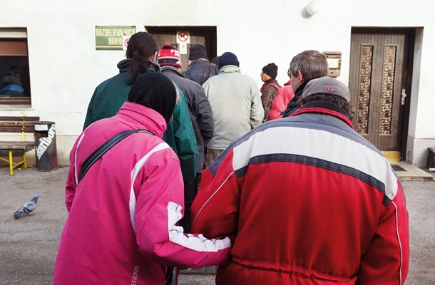 Čakanje na pomoč pred mariborskim Rdečim križem leta 2013