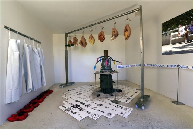 Na razstavi se tako zvrsti slikovito podana ikonografija sodobne družbe. Prizorišče je nekakšna klavnica, v kateri odsekane dlani visijo iz kavljev in med prsti stiskajo simbole propadle oziroma privatizirane industrije-od sladkorja do knjige. Hibridno telo, organizem z zadnjičnimi odprtinami in nekakšnimi štrclji, s katerih visijo prazni baloni. Pod njim pa kup pepela, ki se kopiči na ploščicah z logotipi nekdanjih slovenskih tovarn. Ob njem so odloženi predpasniki in obuvala tistih, ki so opravili to delo in morda že tečejo k naslednjemu koritu, kot v Orwellovi Živalski farmi. Ob tem se vrti projekcija prizora opitega človeka, ki išče ravnotežje. Narodovo telo, ki so mu bili porezani udje, s katerimi je nekoč ustvarjal, se vse bolj sesuva v prah. Zdaj je treba ponovno iskati in najti staro ravnovesje.