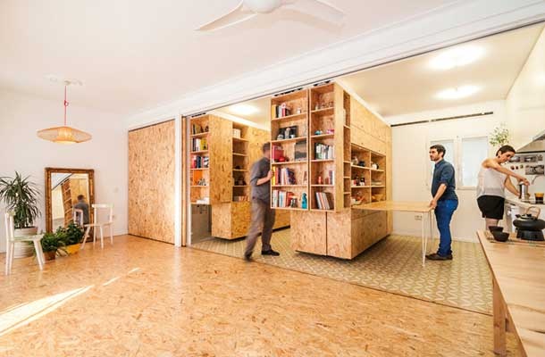 Še korak dalje so naredili v španskem arhitekturnem kolektivu PKMN. V miniaturnem stanovanju v Madridu so zasnoval bivališče za uspešno grafično oblikovalko. Poleg predvidene dnevne sobe, spalnice, kopalnice, kuhinje z jedilnico in ostalih elementov klasičnega stanovanja so izoblikovali še prostor za studio in pisarno za sestanke s strankami. Nerazumno obsežne izhodiščne želje naročnice in pretirano majhna kvadratura stanovanja bi mnoge projektante odvrnile od naloge. Vendar so se arhitekti odločili zagristi v kislo jabolko. Temeljito so proučiti ritem življenja in navade svoje stranke. Izhajali so iz prepričanja, da je prav uporabnik tisti, ki da identiteto prostoru, in da mora prostor odražati delovanje in ritem tistega, ki biva v njem. Tako so zasnovali koncept, ki sledi živahnemu življenju oblikovalke skozi dan.