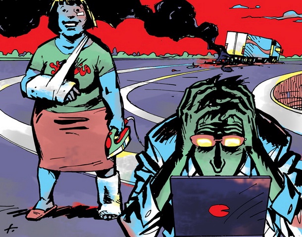 Končno smo prišli do policista, ki je divje mahal in včasih zapiskal. Kapljice so mu pršele s šilta. Za njim sem videl le kamion, postavljen preko celotnega pasu, pod njim pa kupček nečesa, kar ... »Motor,« je dahnila Marija in skoraj zavpila: „Ustavite!“ »Kaj?« »Možev motor!« Nisem mogel odtrgati pogleda od kepe kovine, zarite pod tovornjak. »Tista nalepka, ustavite!« Ustavil sem takoj za tovornjakom. Eden od policistov, ki je navijal merilni trak, je jezno namrščil obraz. »Moj mož, moj mož!« je vpila Marija in hitela proti razbitinam.