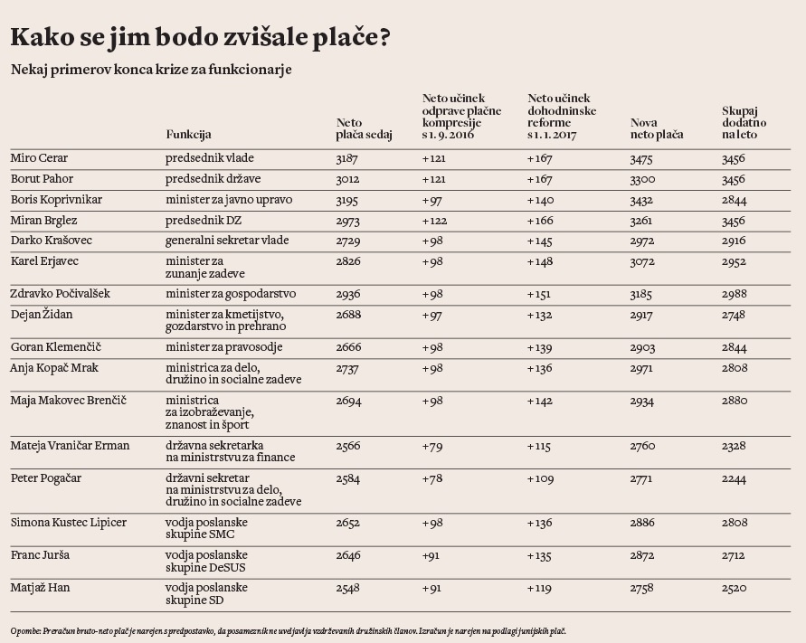 Odprava kompresije plačne lestvice konkretno pomeni, da se bodo predvsem javnim uslužbencem v najvišjih plačnih razredih, torej funkcionarjem, plače najbolj zvišale. Predsednik vlade Miro Cerar, pa tudi predsednik države, predsedniki parlamenta, vrhovnega in ustavnega sodišča bodo recimo od septembra dobili vsak po 263 evrov bruto več na mesec. Ministrom se bodo osnovne plače zvišale za 246 evrov, poslancem in državnim sekretarjem pa za približno 200 evrov na mesec.