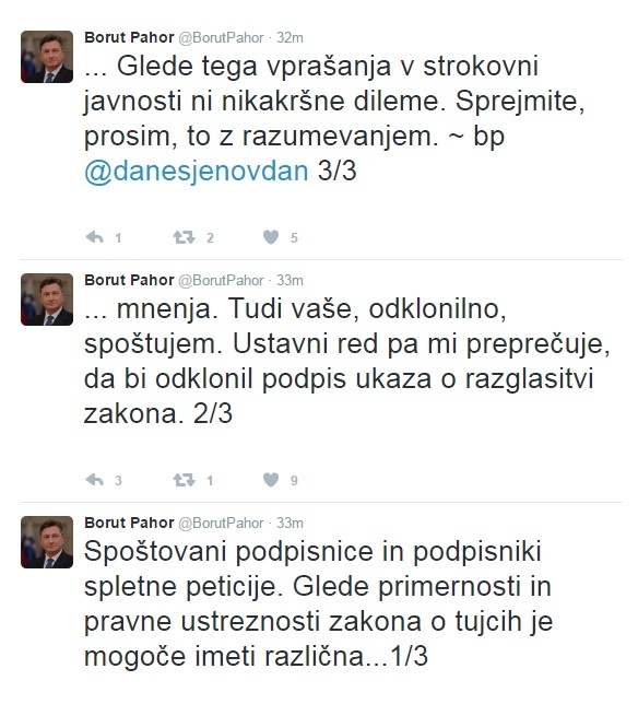 "Spoštovani podpisnice in podpisniki spletne peticije. Glede primernosti in pravne ustreznosti zakona o tujcih je mogoče imeti različna mnenja. Tudi vaše, odklonilno, spoštujem. Ustavni red pa mi preprečuje, da bi odklonil podpis ukaza o razglasitvi zakona. Glede tega vprašanja v strokovni javnosti ni nikakršne dileme. Sprejmite, prosim, to z razumevanjem," je na Twitterju zapisal predsednik republike Borut Pahor. Več o dotični problematiki si lahko preberete v člankih Gospod predsednik, boste ustavili konje? in Predsednik Pahor lahko odstopi.