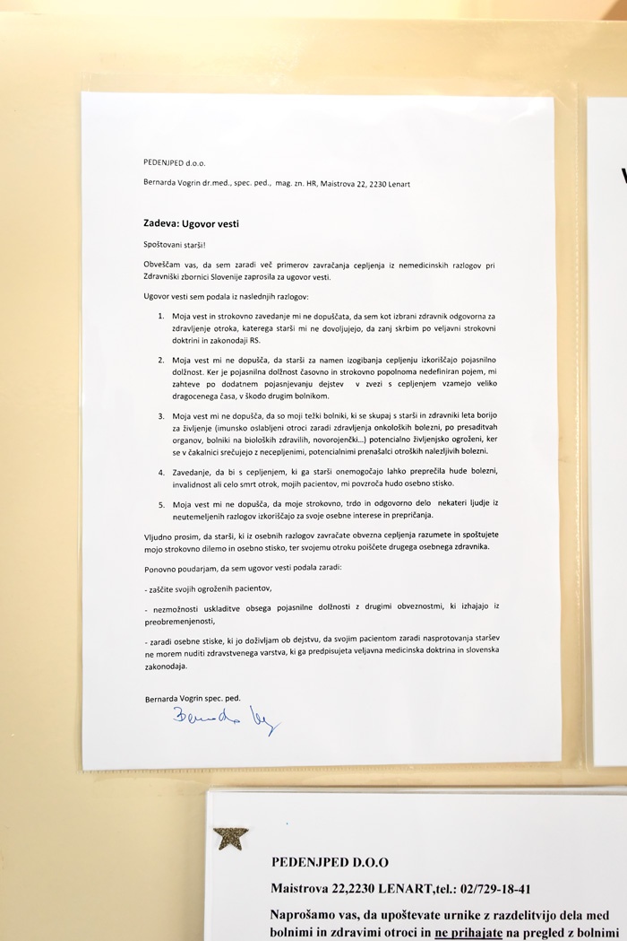 »Obveščam vas, da sem zaradi več primerov zavračanja cepljenja iz nemedicinskih razlogov pri Zdravniški zbornici Slovenije zaprosila za ugovor vesti.« Tako se začne obvestilo, ki je obešeno na vratih ambulante pediatrinje iz Lenarta v Slovenskih goricah Bernarde Vogrin in ki je v minulih dneh zaokrožilo po internetu. »Zavezana sem delovati po strokovni doktrini. Za otroka sem dolžna poskrbeti v skladu z zakonom, medicinsko doktrino in svojo vestjo. In če mi starši tega ne dovolijo, potem ne vem, kaj lahko naredim za tega otroka,« nam je povedala v telefonskem pogovoru.