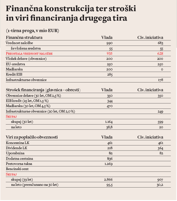 Da pridete do tega, ni treba biti posebno vešč matematike. Vzemimo vladni predlog finančne konstrukcije gradnje drugega tira v skupni vrednosti nekaj manj od milijarde evrov (denimo 990 mio evrov, brez DDV). 200 mio evrov naj bi bil vladni kapitalski vložek v podjetje 2TDK, ki bo investitor projekta, 250 mio evrov naj bi bilo nepovratnih sredstev EU, 200 mio evrov naj bi primaknila Madžarska kot kapitalski vložek, ki ga je treba poplačati skozi letni donos (torej gre za kredit), preostalih 285 mio evrov pa naj bi si investitor sposodil v obliki kredita pri Evropski investicijski banki (EIB). Ob upoštevanju ustreznih obrestnih mer (2,5 % na državne obveznice, 1,5 % na EIB kredit in 4,5 % »donos« na madžarski kredit) bi skupni strošek gradnje drugega tira, s stroški financiranja vred, znašal 1.164 mio evrov ali povprečno slabih 39 mio evrov na leto v obdobju 30 let.