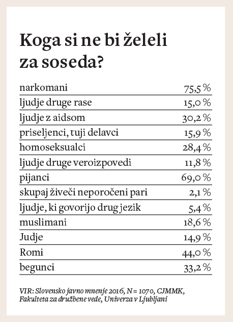 To kaže, da je »nestrpnost« v Sloveniji konstantna in da se glede na vsakokratne debate preliva med enimi in drugimi, zunanjimi in notranjimi sovražniki. Nestrpnost do Romov ali homoseksualcev se je gotovo povečala zato, ker sta prav to skupini, ki sta se v zadnjih letih znašli v središču javnih razprav, oziroma ker sta povzdignili svoj glas, opozorili nase ali zahtevali zase določene pravice. Tako seveda tudi ni presenetljivo, da je lani kar 33,2 odstotka vprašanih izjavilo, da si za soseda ne želi begunca. »Zanimivo« pa je tudi, da si 2,1 odstotka Slovencev ne želi za soseda niti skupaj živečega neporočenega para.