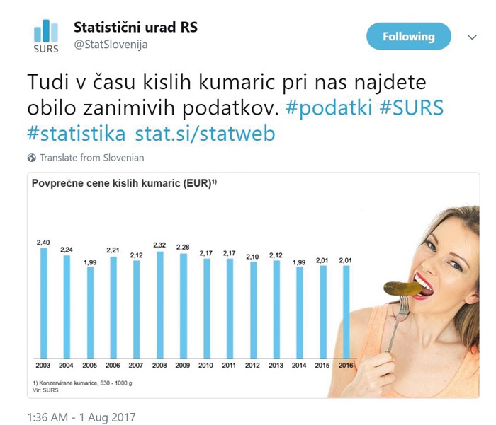 Na profilu Statističnega urada Republike Slovenije (SURS) na Twitterju najdemo številne zanimive statistične podatke – objave o obrestnih merah, turističnih prenočitvah, najpogostejših imenih, pa tudi o povprečni ceni kislih kumaric.