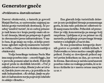 Nerodno izražen dobronamerni nasvet je odprl številna vprašanja o zmogljivosti in mejah slovenskega turizma. Smo postali žrtev lastnega uspeha? Ali gremo po poti množičnega turizma, ki se ga glede na sprejete strategije srdito otepamo? Ali Slovenci v turistični sezoni postajamo drugorazredni prebivalci?