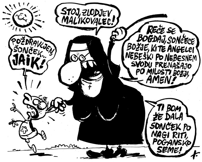 »Že v vrtcih navajajo malčke na jutranji pozdrav soncu. Pa ne gre za to, da otrok pomaha sončku, kakor pač pomaha muci ali drevesu ob poti, ampak gre za kultno vajo, nekakšen poganski običaj.«