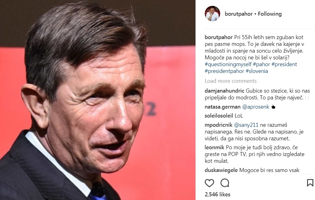 "Pri 55-ih letih sem zguban kot pes pasme mops. To je davek na kajenje v mladosti in spanje na soncu celo življenje. Mogoče pa nocoj ne bi šel v solarij?" (Borut Pahor na Instagramu)