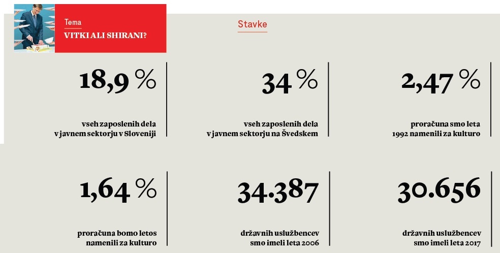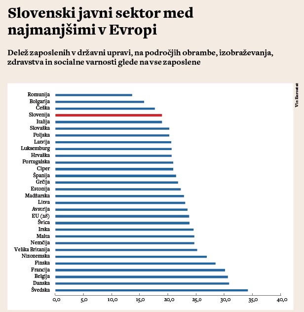 Navkljub očitno splošnemu prepričanju o gromozanskem številu javno zaposlenih in njihovem lagodnem življenju ima Slovenija danes enega najmanjših javnih sektorjev v Evropski uniji. Po podatkih evropskega statističnega urada imajo manj javnih uslužbencev, glede na vse zaposlene, le še Češka, Bolgarija in Romunija, skoraj enkrat več v relativnem smislu pa jih imajo Švedska, Danska in Belgija. Razvite države imajo razvit in velik javni sektor, Slovenija pa je v zadnji krizi šla po nasprotni poti. Nižala je davke in rezala državo. Po podatkih, ki jih je zbral ekonomist Bine Kordež, v Sloveniji glede na BDP poberemo 37,7 odstotka davkov – v osmih najbolj razvitih državah EU približno 40 odstotkov. Hkrati pa imajo najrazvitejše EU-države v javnem sektorju zaposlenih 30 odstotkov vseh zaposlenih, v Sloveniji le 22. Ali ne bi bilo razvojno smiselno dvigniti davke in okrepiti javni sektor? »Zaradi vsakega zdravnika, socialnega delavca, učitelja, ki ga na novo zaposlite, boste zmanjšali dolg države, ker boste z njihovo zaposlitvijo povečali BDP. Zato je bilo odpuščanje javno zaposlenih v minuli ekonomski krizi žalostno in tudi nepotrebno,« pravi Dragoš. Po nekaterih izračunih je leta 2012 z varčevanjem država dobila 460 milijonov evrov, nato pa se je zaradi posledic varčevanja – tudi nižje javne porabe – gospodarstvo skrčilo za 700 milijonov evrov.
