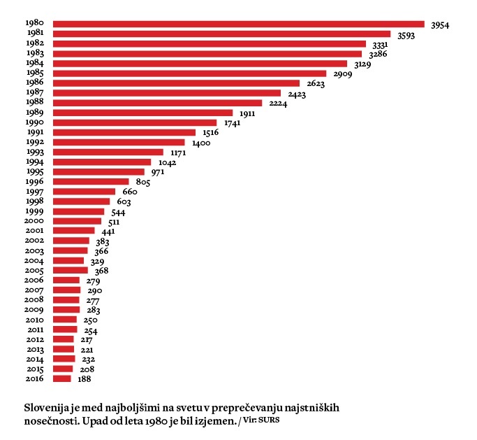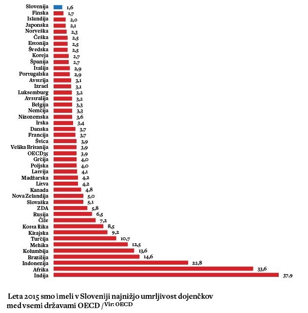 V Sloveniji je glede na lani jeseni objavljeno poročilo Organizacije za gospodarsko sodelovanje in razvoj (OECD) umrljivost dojenčkov leta 2015 znašala le 1,6 na tisoč živorojenih otrok. To je najmanj med vsemi državami članicami OECD, manj od Japonske in tudi manj od vseh skandinavskih držav, ki si jih v zdravstvu praviloma jemljemo za zgled. V primerjavi z letom 1990 smo dosegli tudi največje zmanjšanje umrljivosti dojenčkov – znižala se je za več kot 80 odstotkov.